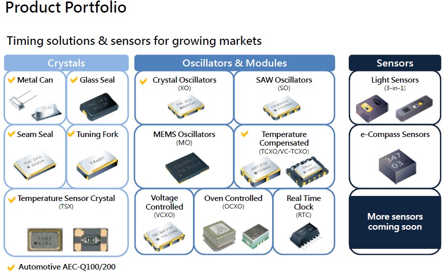 臺(tái)灣晶技為一專業(yè)之頻率組件與感測(cè)組件供貨商,自1983年成立以來,始終致力于石英晶體相關(guān)諧振器(Crystal)、振蕩器(Oscillator) 等頻率組件之研發(fā)、設(shè)計(jì)、生產(chǎn)與銷售,并因應(yīng)市場(chǎng)應(yīng)用與需求.產(chǎn)品被廣泛應(yīng)用到電子數(shù)碼產(chǎn)品,衛(wèi)星GPS導(dǎo)航,智能電腦,智能手機(jī)等產(chǎn)品.月產(chǎn)量8000萬只,成為同行業(yè)中的佼佼者,產(chǎn)品遠(yuǎn)銷西歐一帶國(guó)家,巴西,中國(guó)香港,大陸,中國(guó)臺(tái)灣等全球市場(chǎng).