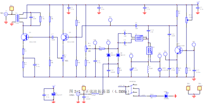 信號流程:Q3振蕩至Q2跟隨至Q1諧振選頻放大輸出;調(diào)頻W1(壓控調(diào)諧,電調(diào)諧),調(diào)幅W2
