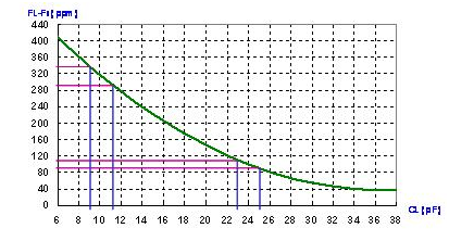 在(左圖)中, CL=24 pF 時(shí)的頻率敏感度是10 ppm/pF, 及CL=10 pF時(shí)的頻率敏感度是20 ppm/pF. 在并聯(lián)線路中, 負(fù)載電容越小, 頻率對(duì)負(fù)載電容變化的敏感度越高. 相反的, 負(fù)載電容越大, 頻率對(duì)負(fù)載電容變化的敏感度越低. 這就是石英晶體共振子用于VCXO線路上時(shí), 線路設(shè)計(jì)上會(huì)選用較小負(fù)載電容. 反之, 在要求較準(zhǔn)確的頻率信號(hào)時(shí), 線路設(shè)計(jì)上會(huì)選用較高的負(fù)載電容.