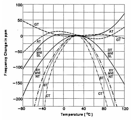 大部份的石英晶體產(chǎn)品是用于電子線路上的參考頻率基準(zhǔn)或頻率控制組件, 所以, 頻率與工作環(huán)境溫度的特性是一個很重要的參數(shù). 事實上, 良好的頻率與溫度(frequeny versus temperature)特性也是選用石英做為頻率組件的主要因素之一. 經(jīng)由適當(dāng)?shù)亩x及設(shè)計, 石英晶體組件可以很容易的就滿足到以百萬分之一 (parts per million, ppm) 單位等級的頻率誤差范圍. 若以離散電路方式將LCR零件組成高頻振蕩線路, 雖然也可以在小量生產(chǎn)規(guī)模達到所需要的參考頻率信號誤差在ppm或sub-ppm等級要求, 可是這種方式無法滿足產(chǎn)業(yè)要達到的量產(chǎn)規(guī)模. .jpg)