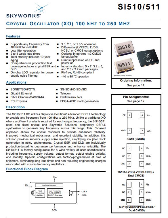 編碼511ABA25M0000BAG,Si510/511 XO時鐘石英晶體振蕩器采用了Skyworks Solutions公司先進(jìn)的DSPLL技術(shù)提供從100千赫到250兆赫的任何頻率。不像傳統(tǒng)的XO其中每個輸出頻率需要不同的晶體,Si510/511使用一個固定晶體和Skyworks Solutions的專有DSPLL合成器在這個范圍內(nèi)產(chǎn)生任何頻率。這IC-based方法允許晶體諧振器提供更高的可靠性,提高了機(jī)械穩(wěn)健性,穩(wěn)定性極佳。此外,這解決方案提供卓越的電源噪聲抑制,簡化低抖動時鐘在嘈雜的環(huán)境中產(chǎn)生。晶體ESR和DLD是獨(dú)立的生產(chǎn)測試,以保證性能和提高可靠性。Si510/511可在工廠配置,適用于各種用戶規(guī)格;包括頻率、電源電壓、輸出格式、輸出使能極性、和穩(wěn)定性。特定的配置是在出廠時編程的運(yùn)輸,消除了漫長的交貨期和非經(jīng)常性的工程費(fèi)用與自定義頻率振蕩器相關(guān)聯(lián)。