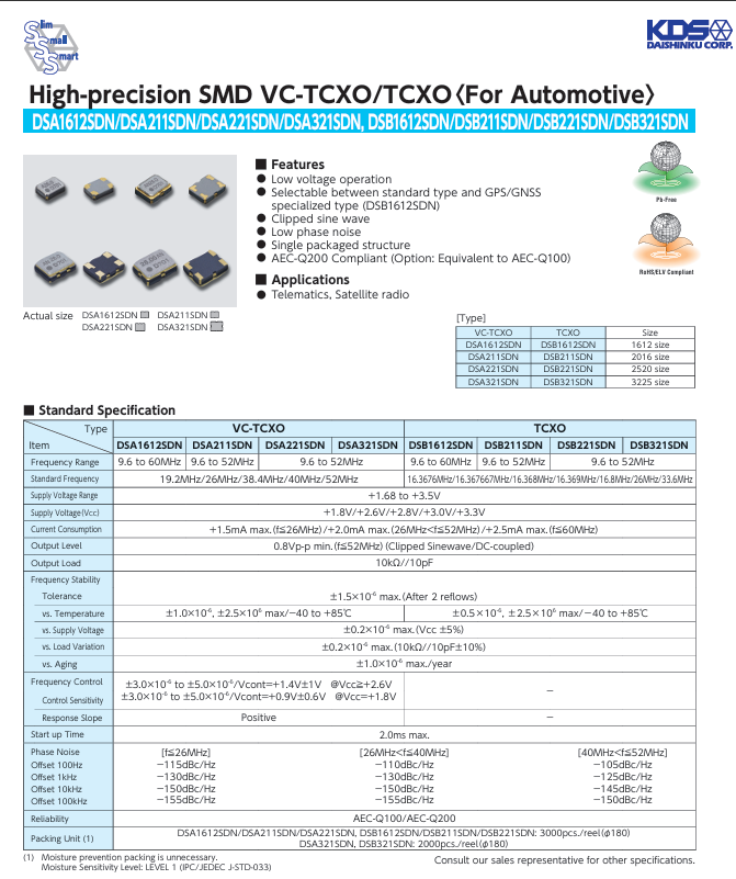 這款VC-TCXO有源晶振的核心優(yōu)勢,在于其對極端環(huán)境的超強(qiáng)適應(yīng)力.作為符合AEC-Q200標(biāo)準(zhǔn)的車規(guī)產(chǎn)品,它能在-40℃至+85℃的寬溫區(qū)間內(nèi)穩(wěn)定運(yùn)行,頻率偏差控制在±1.0×10??以內(nèi).這種嚴(yán)苛環(huán)境下的穩(wěn)定性,恰是車載系統(tǒng)的生命線——進(jìn)口晶振無論是遠(yuǎn)程信息處理傳輸數(shù)據(jù),還是衛(wèi)星廣播接收信號,微小的頻率偏差都可能導(dǎo)致通信中斷.而其低相位噪聲特性,更讓信號傳輸如“靜水行舟”,在10kΩ//10pF的負(fù)載條件下,相位噪聲指標(biāo)可達(dá)-155dBc/Hz,為車載通信筑起抗干擾的“防護(hù)盾”.KDS溫補(bǔ)晶振,大真空有源晶振石英晶振