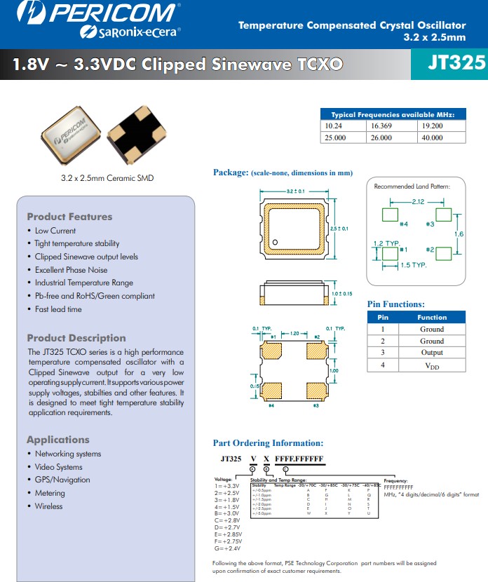 亞陶晶振JT325TCXO系列是一款高性能溫度補(bǔ)償振蕩器,具有削波正弦波輸出,可實(shí)現(xiàn)非常低的工作電源電流.它支持各種電源電壓、穩(wěn)定性和其他功能.它旨在滿足嚴(yán)格的溫度穩(wěn)定性應(yīng)用要求.