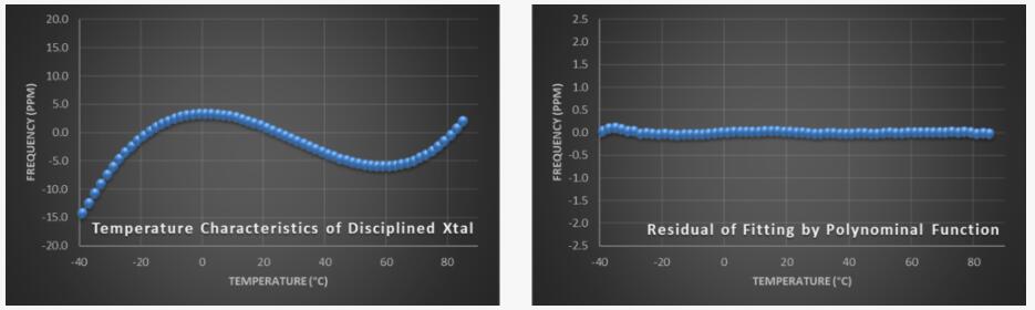 普通石英坯料可能存在輕微的缺陷或雜質,例如石英表面的拋光區(qū)域不足或晶坯中的晶格無序.這些微小的不規(guī)則性可能會導致特定溫度范圍內的快速頻率跳躍,這不能用有限次多項式方程來描述.因此,TCXO溫補晶振的補償機制在這個特定的溫度范圍內將是不準確的.這種現(xiàn)象稱為“頻率擾動”,在下面的圖4中進行了可視化.