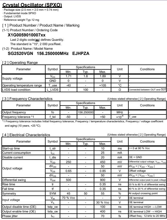 | X1G005941000515 | SG2520VHN | 156.250000 MHz | 2.50 x 2.00 x 0.84 mm | LVDS | 3.135 to 3.465 V | -40 to 105 °C | +/-20 ppm | ≤ 25.0 mA |