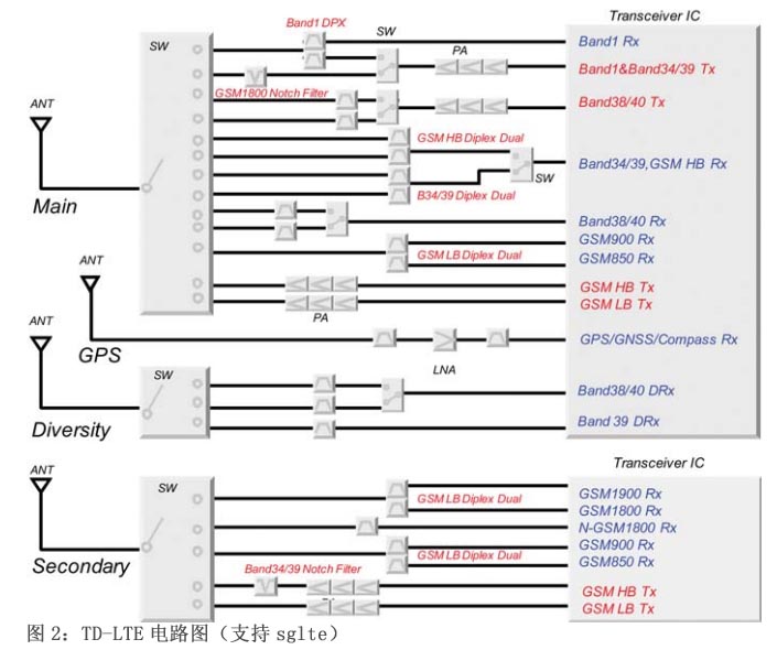 圖2說明了一個電路TD-LTE(sglte).目前終端支持TD-LTE當(dāng)然需要進行雙重模式或三模式支持GSM或UMTS以提供語音通信.對于GSM,四條帶,850MHz 900MHz 1800MHz和1900MHz,,,,一般為國際漫游的支持,和一個過濾器是將每個波段的接收端上.UMTS,因為它的帶1雙工(FDD,天線共享器)是必需的.