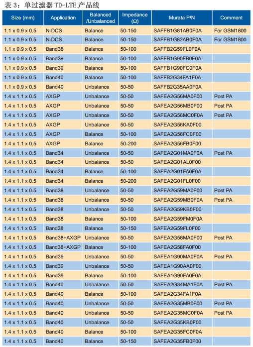 1至3顯示的表面聲波(SAW)的產(chǎn)品線表TD-LTE,村田制作所發(fā)布了到目前為止濾波器.雙濾波器列于表1,表2和表3中的陷波濾波器,單濾波器.