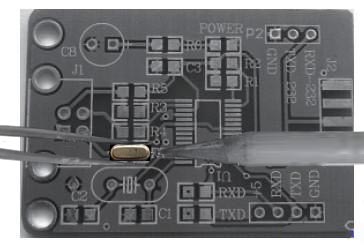 焊接和清除多余會造成短路的焊錫之后,石英晶體諧振器基本上就算是焊接好了.但是由于使用松香助焊和吸錫帶吸錫的緣故,致使電路板上的晶振腳位的周圍殘留了一些松香,雖然并不影響晶振的工作和正常使用,但也不是太美觀.而且有可能造成檢查時不方便.因此有必要對這些殘余物進行清理.常用的清理方法可以用洗板水,在這里,采用了酒精清洗,清洗工具可以用棉簽,也可以用鑷子夾著衛(wèi)生紙之類進行.清洗擦除時應該注意的是酒精要適量,其濃度最好較高,以快速溶解松香之類的殘留物.其次,擦除的力道要控制好,不能太大,以免擦傷晶振焊接部分.此時可以用烙鐵或者熱風槍對酒精擦洗位置進行適當加熱以讓殘余酒精快速揮發(fā).至此,石英晶振的焊接程序就算是結(jié)束了.